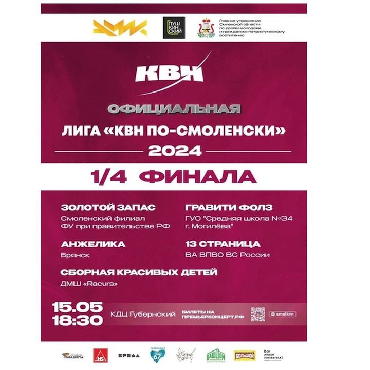 Сегодня на сцену выйдут команды: «Золотой Запас» (Смоленск), «Анжелика» (Брянск), «Гравити Фолз» (Могилев), «13-я страница» (Смоленск) и Сборная красивых детей (Смоленск).