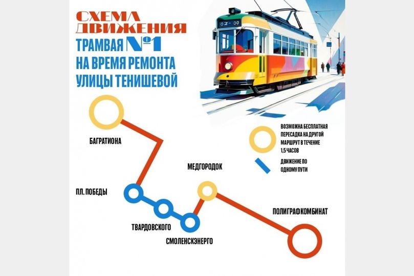 Изменения в схеме движения трамваев будут представлены на карточках ниже. Обратите внимание, что при движении трамваев из района Площади Победы остановки "Твардовского" и "Смоленскэнерго" не будут осуществляться.