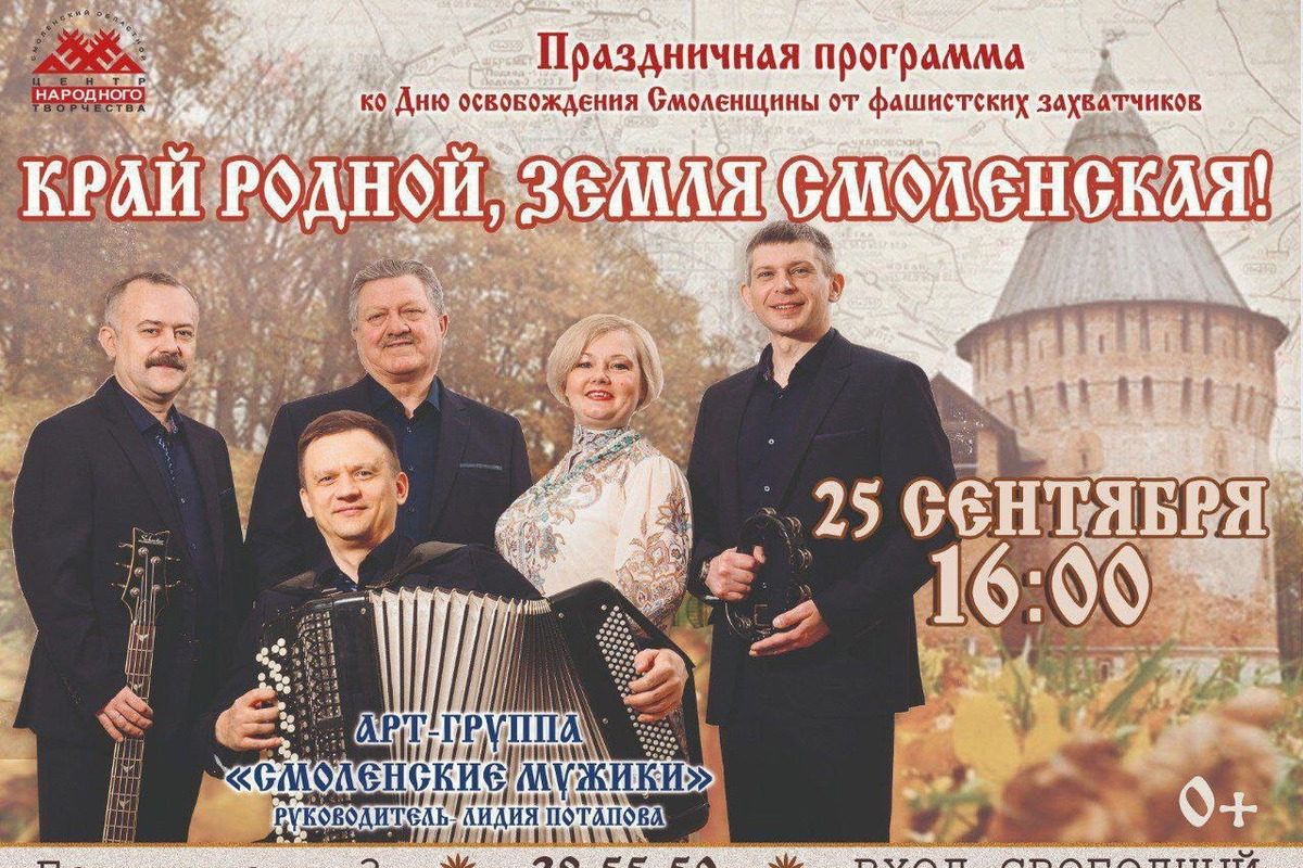 25 сентября в 16:00 смолян приглашают на праздничный концерт под названием «Край родной, земля Смоленская!», который посвящен 81-й годовщине освобождения Смоленщины от немецко-фашистских захватчиков. Концерт будет проводиться на территории Смоленска и будет включать в себя выступления талантливых артистов Центра народного творчества – арт-группы «Смоленские мужики».