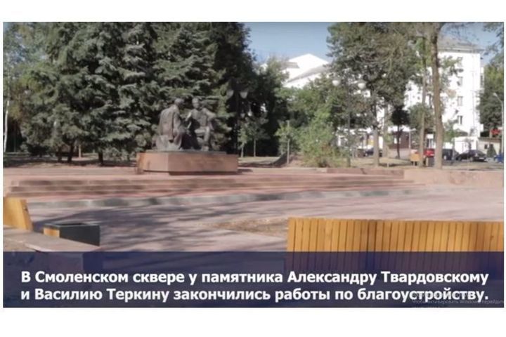 В центре Смоленска завершены работы по благоустройству в сквере у памятника Александру ТрифоновичуТвардовскому и Василию Теркину. Ремонт включал замену покрытия, установку бортовых камней, укладку тротуарной плитки, облицовку подпорных стен, а также монтаж новых лестниц с перильными ограждениями, скамеек и урн.