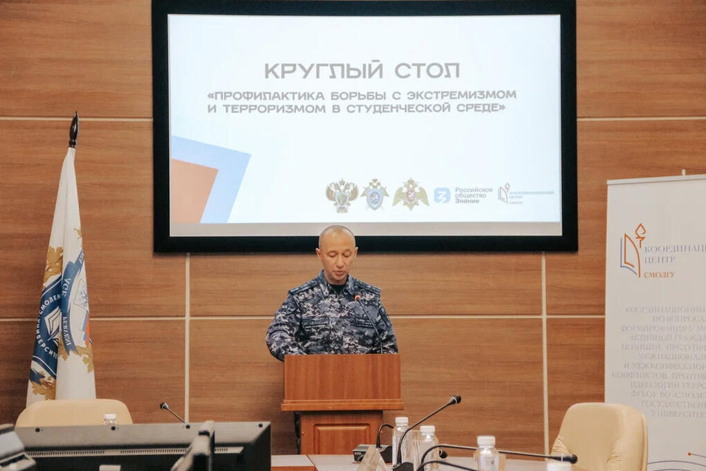 В канун Дня Конституции Российской Федерации в Смоленском государственном университете состоялся круглый стол, посвященный профилактике экстремизма и терроризма в студенческой среде. На мероприятии выступил заместитель начальника Управления Росгвардии по Смоленской области полковник Антон Супрун.