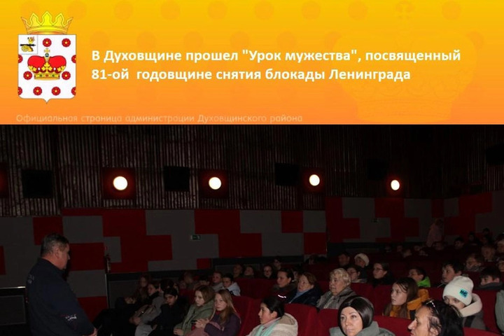 В кинотеатре «Заря» города Духовщины прошел «Урок Мужества», посвященный 81-ой годовщине снятия блокады Ленинграда. Духовщинским школьникам и членам клуба "Золотой возраст" рассказали о голоде и лишениях ленинградцев, их стойкости и вере в победу, познакомили с книгами о блокаде и раздали кусочки хлеба, символизирующие ежедневную норму в 125 граммов, которую получали жители осажденного города. После этого состоялся показ художественного фильма "Блокадный дневник".