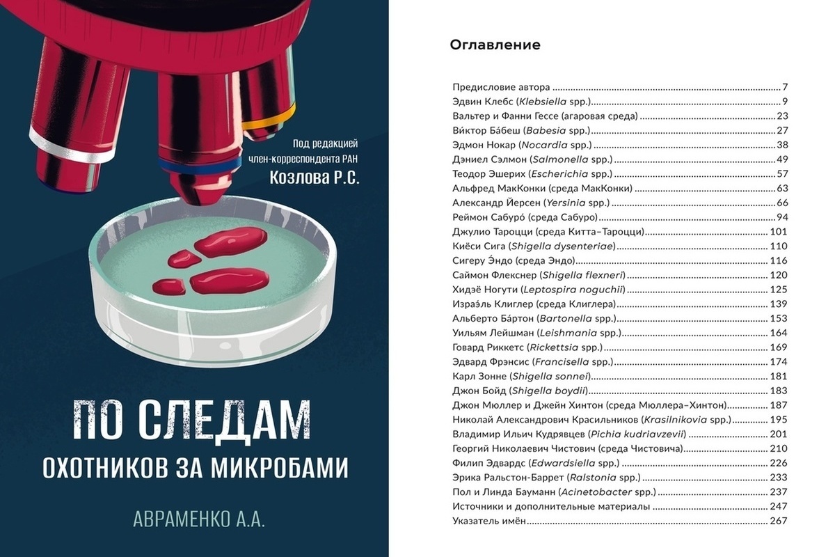 Автор книги — младший научный сотрудник НИИАХ Андрей Алексеевич Авраменко, собравший уникальные материалы со всех уголков мира. Архивы, дневники, статьи и воспоминания потомков позволили создать настоящее путешествие, которое перенесёт читателей на поля битв Франко-прусской войны, к предгорьям Анд в Южной Америке, на живописные берега Вьетнама и в Палестину, кишащую малярийными комарами. Вместе с выдающимися микробиологами — людьми, посвятившими своей работе всё, включая собственное здоровье, вы пройдёте этот путь, открывая тайны медицинской науки. Книга доступна по ссылке.