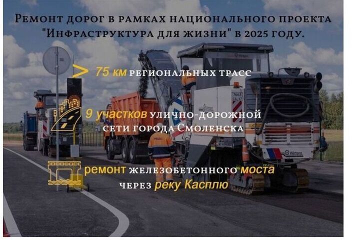 В 2025 году в Смоленской области, в рамках нового национального проекта «Инфраструктура для жизни», планируется улучшить более 75 км региональных трасс и девять участков улично-дорожной сети Смоленска.