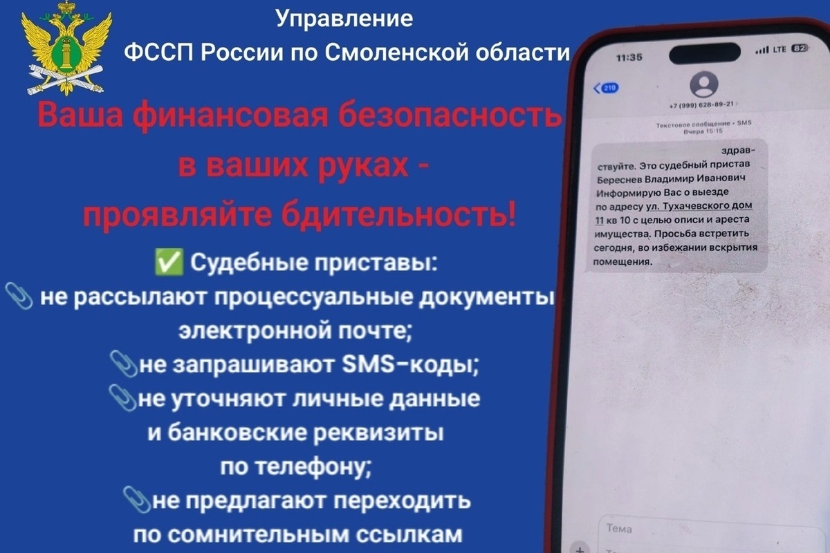 Управление ФССП России по Смоленской области предупреждает жителей об активном распространении фальшивых сообщений от лица судебных приставов через мессенджеры. Напоминаем, что сотрудники Федеральной службы судебных приставов не отправляют уведомления по электронной почте, не запрашивают коды из SMS, не организуют встречи с должниками, а также не выясняют личные данные и финансовую информацию граждан.