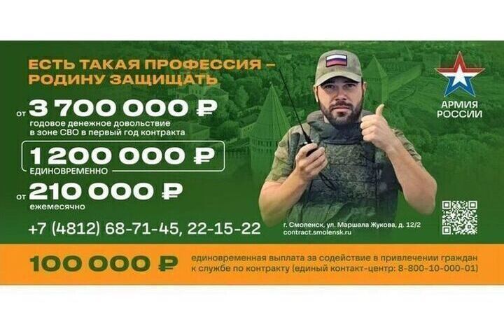 С 1 января 2025 года при заключении контракта на военную службу в Смоленской области предоставляется единоразовая выплата в размере 1,2 млн рублей. Кроме того, смоляне, которые оказывают содействие в подготовке кандидата к заключению контракта, теперь могут получить 100 тысяч рублей. Граждане, заключившие контракт на военную службу, получают возможность списать долги по кредитам до 10 млн. рублей.