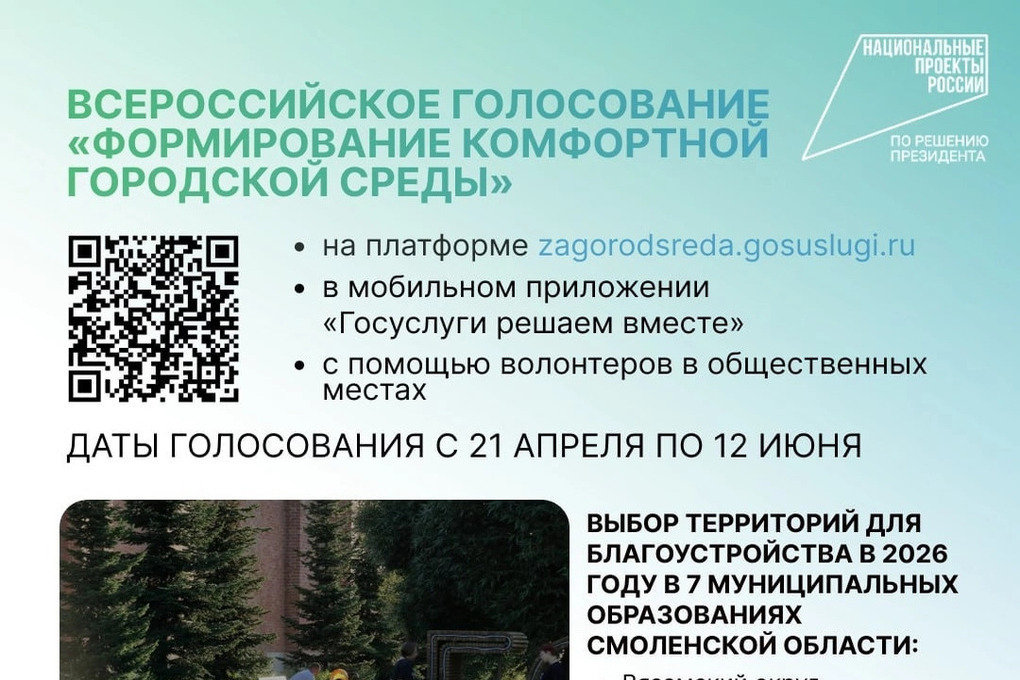 В этом году голосование проходит в Вяземском, Рославльском, Ярцевском, Сафоновском, Гагаринском округах, а также в Смоленске и Десногорске. До 12 июня жители региона старше 14 лет смогут проголосовать на онлайн-платформе zagorodsreda.gosuslugi.ru, через мобильное приложение "Госуслуги Решаем вместе" или при помощи волонтеров в крупных торговых центрах и других общественных местах.
