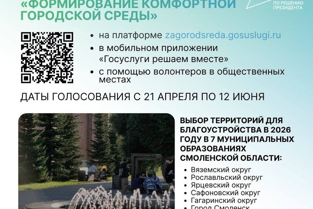 До 12 июня жители Вяземского, Рославльского, Ярцевского, Сафоновского и Гагаринского округов, а также Смоленска и Десногорска выбирают объекты для благоустройства: парки, скверы, бульвары, территории у памятников и другие пространства.