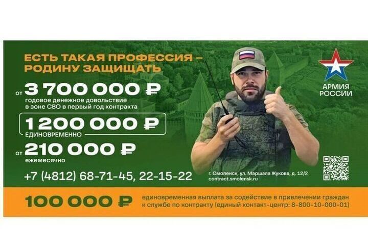 При заключении контракта на военную службу в Смоленской области предоставляется единоразовая выплата в размере 1,2 млн рублей. Кроме того, смоляне, которые оказывают содействие в подготовке кандидата к заключению контракта с Минобороны России, теперь могут получить 100 тысяч рублей. Граждане, заключившие контракт на военную службу, получают возможность списать долги по кредитам до 10 млн. рублей.