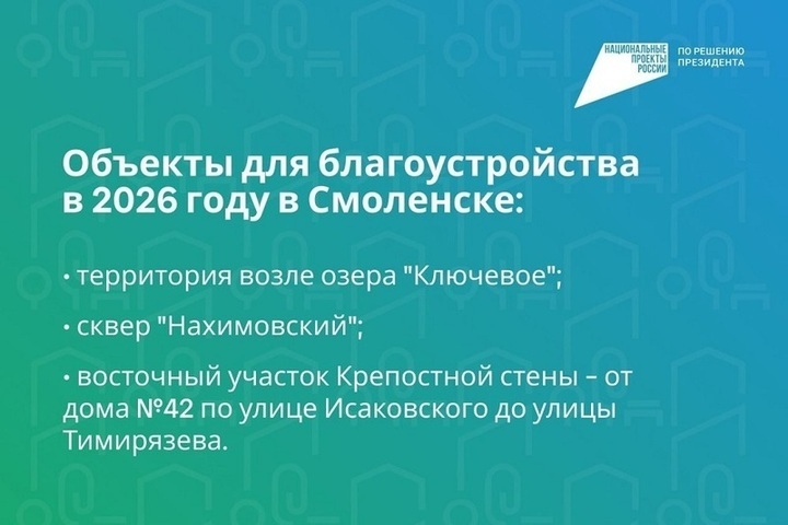 По итогам голосования в рамках федпроекта «Формирование комфортной городской среды» нацпроекта «Инфраструктура для жизни», который реализуется по решению президента РФ, в Смоленской области в 2026 году будут благоустроены девять локаций: участок возле озера «Ключевое» в городе Смоленске, сквер «Нахимовский» в городе Смоленске и восточный участок Крепостной стены (от дома №42 по улице Исаковского до улицы Тимирязева) в городе Смоленске; сквер у Привокзальной площади в городе Вязьма; пешеходная зона от микрорайона №15 до улицы Мичурина в городе Рославль; стадион на улице Ленинградской в городе Сафонове; парк Старозавопье в городе Ярцево; парковая зона возле памятника «Святые благоверные князь Пётр и княгиня Феврония Муромские» в городе Десногорске; общественная территория на улице Солнцева в городе Гагарин.
