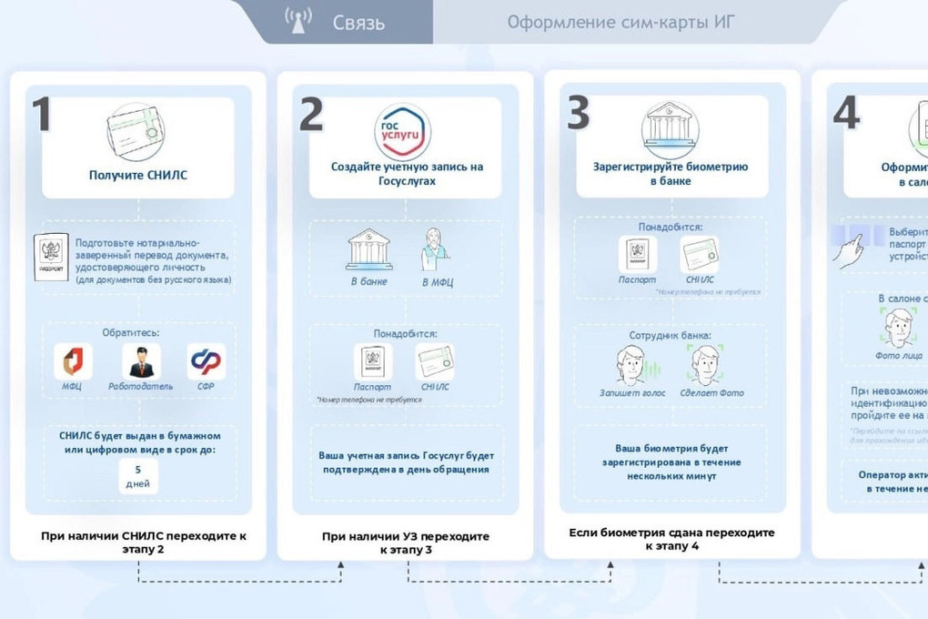 Согласно новым требованиям, иностранцы обязаны лично посетить офис оператора связи для заключения договора. При этом необходимо предоставить СНИЛС, подтвердить учётную запись на портале «Госуслуги» и зарегистрировать свои биометрические данные.