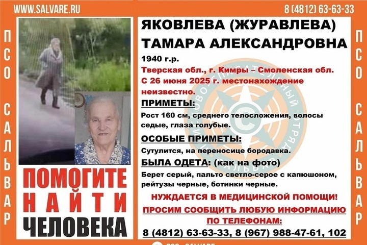 Яковлева (Журавлёва) Тамара Александровна 1940 года рождения может находиться в Смоленской или Тверской области, сообщают в официальном паблике поисково-спасательного отряда «Сальвар» в социальной сети «ВКонтакте».