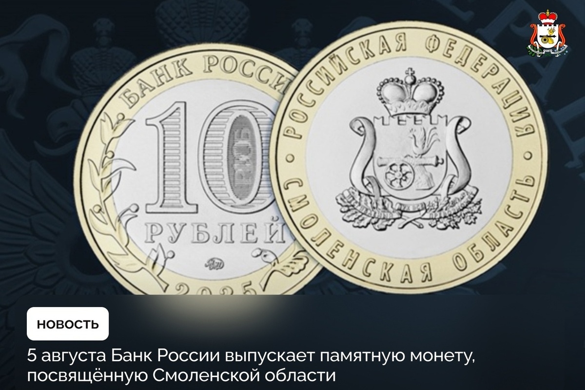 5 августа Банк России вводит в обращение памятную монету номиналом 10 рублей, посвящённую Смоленской области. Эта монета входит в серию «Российская Федерация» и станет не только предметом коллекционирования, но и обычным платёжным средством, которое можно использовать в магазинах, кафе и других заведения, принимающих наличные.