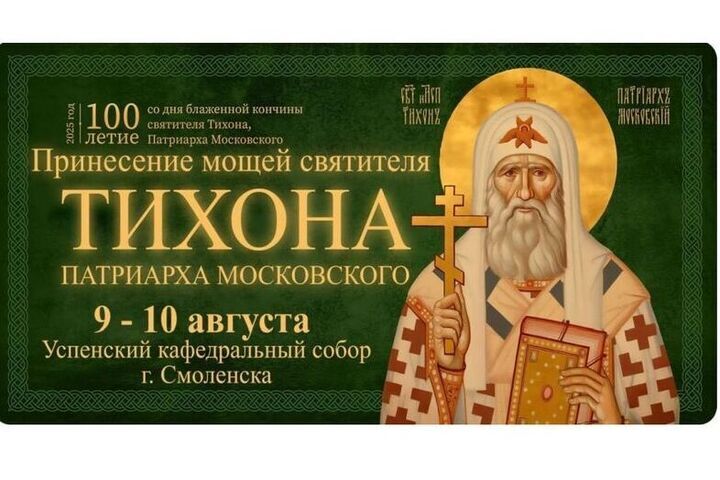 По благословению Святейшего Патриарха Московского и всея Руси Кирилла в Успенский кафедральный собор будет доставлен ковчег с мощами святителя Тихона, Патриарха Московского. Это событие приурочено к 100-летию со дня блаженной кончины святителя. Ковчег будет находиться в Смоленске с 9 по 10 августа 2025 года, а торжественная встреча с мощами состоится 9 августа в 8.30.