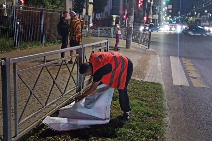 По поручению главы города осуществляется демонтаж незаконных рекламных конструкций. Так, во время ночной уборки с дорожного ограждения на пересечении улиц Кирова и проспекта Гагарина была снята очередная растяжка.
