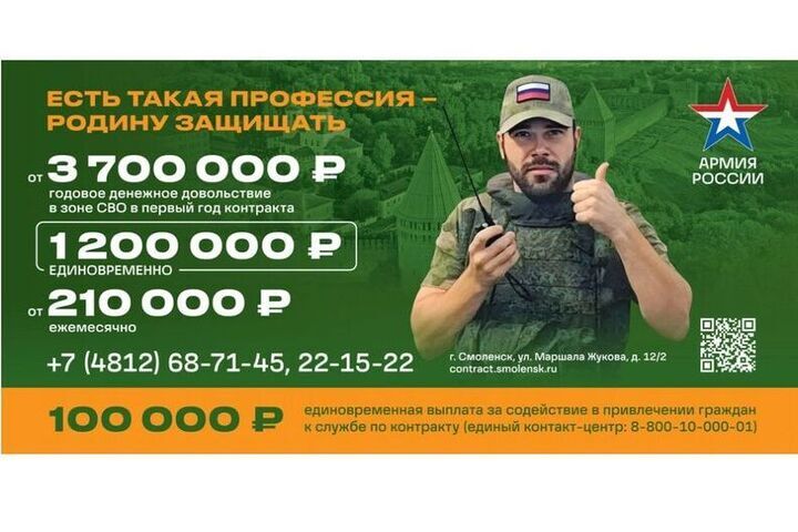 При заключении контракта на военную службу в Смоленской области предоставляется единоразовая выплата в размере 1,2 млн рублей. Кроме того, смоляне, которые оказывают содействие в подготовке кандидата к заключению контракта, теперь могут получить 100 тысяч рублей. Граждане, заключившие контракт на военную службу, получают возможность списать долги по кредитам до 10 млн. рублей.