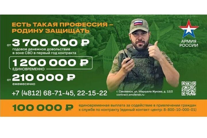При заключении контракта на военную службу в Смоленской области предоставляется единоразовая выплата в размере 1,2 млн рублей. Кроме того, смоляне, которые оказывают содействие в подготовке кандидата к заключению контракта, теперь могут получить 100 тысяч рублей. Граждане, заключившие контракт на военную службу, получают возможность списать долги по кредитам до 10 млн. рублей.