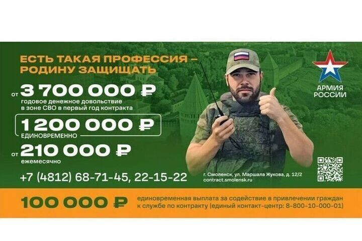 При заключении контракта на военную службу в Смоленской области предоставляется единоразовая выплата в размере 1,4 млн рублей. Кроме того, смоляне, которые оказывают содействие в подготовке кандидата к заключению контракта с военными ведомствами России, теперь могут получить 100 тысяч рублей. Граждане, заключившие контракт на военную службу, получают возможность списать долги по кредитам до 10 млн. рублей.
