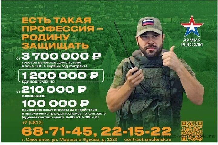 При заключении контракта на военную службу в Смоленской области предоставляется единоразовая выплата в размере 1,4 млн рублей. Кроме того, смоляне, которые оказывают содействие в подготовке кандидата к заключению контракта, теперь могут получить 100 тысяч рублей. Граждане, заключившие контракт на военную службу, получают возможность списать долги по кредитам до 10 млн. рублей.