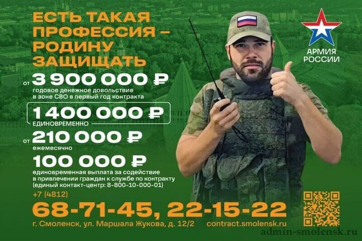 При заключении контракта на военную службу в Смоленской области предоставляется единоразовая выплата в размере 1,4 млн рублей. Кроме того, смоляне, которые оказывают содействие в подготовке кандидата к заключению контракта, теперь могут получить 100 тысяч рублей. Граждане, заключившие контракт на военную службу, получают возможность списать долги по кредитам до 10 млн. рублей.