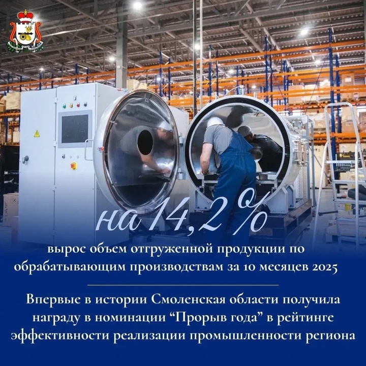 Промышленный сектор региона также показывает позитивную динамику — увеличивается объём отгруженной продукции. Впервые Смоленская область получила федеральную награду «Прорыв года» в рейтинге эффективности реализации промышленной политики, что подтверждает высокий уровень достижений в данной сфере.